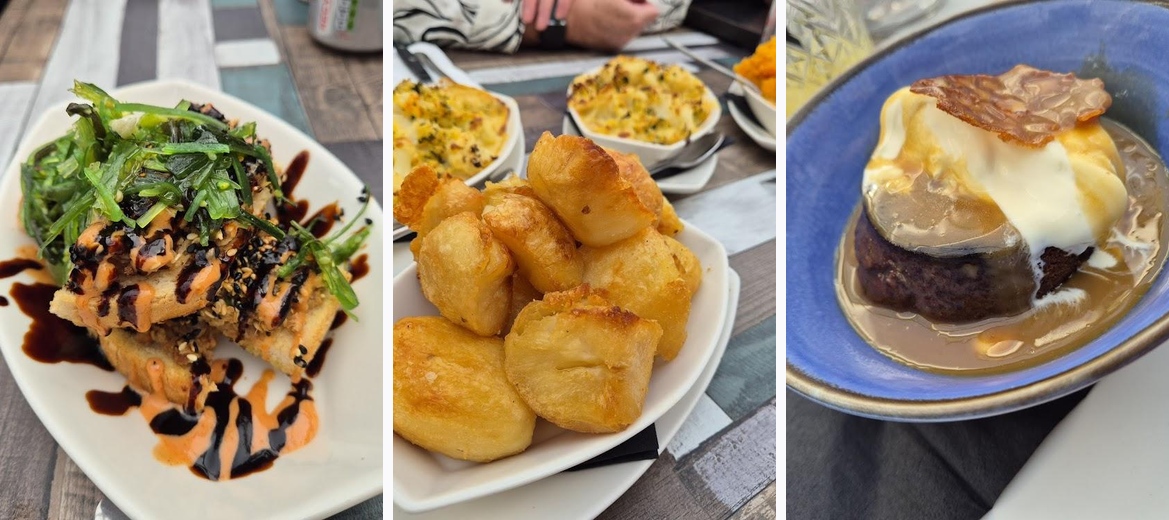 Starters were delicious, we had duck roll and prawn toast. We then had roast beef which was tender, cooked nicely and it came with a huge amount of side dishes which were all cooked to perfection. The desserts were sticky toffee pudding and chocolate fondant which were both again excellent. Highly recommend this place.